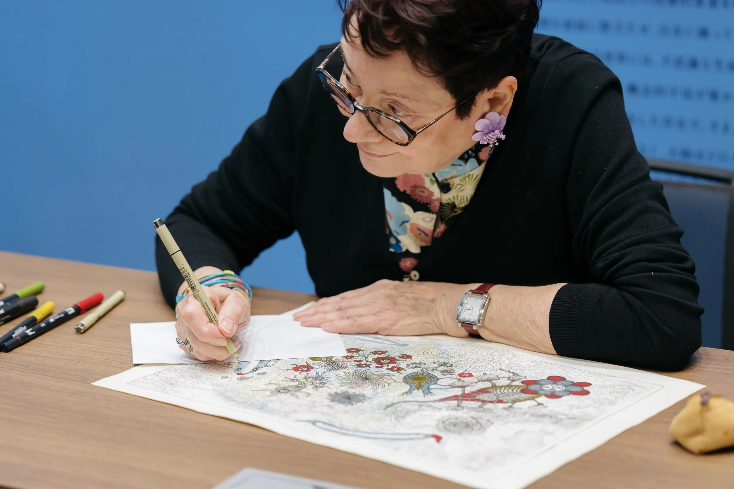 Son travail se distingue par un trait minutieux, qui déploie une multitude de détails et confère à ses œuvres une profondeur singulière.