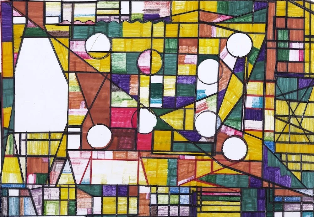 À première vue, ces peintures semblent présenter des motifs géométriques abstraits. Pourtant, beaucoup seront surpris d’apprendre qu’elles représentent en réalité des bâtiments, agencés de manière unique par l’artiste. Yaegashi a développé ce style singulier dès son enfance, sans formation académique, et il lui a consacré plus d’un demi-siècle. L’ensemble de son œuvre se chiffre probablement par milliers.