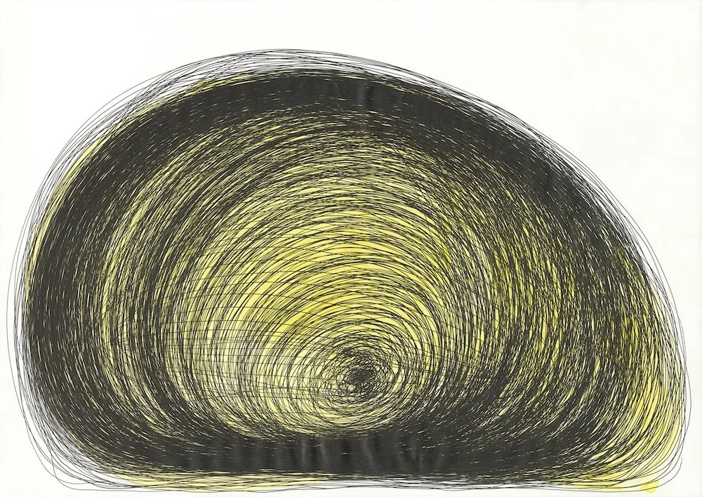 Au fil du temps, ses gestes évoluent et les lettres se transforment progressivement en cercles superposés, comme pour savourer la pure sensation du dessin. En utilisant peintures, stylos à bille et crayons de couleur, elle compose ainsi des œuvres vives faites d’innombrables anneaux entrelacés.